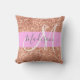 Glam and girly pink, peach, gold glitter sparkles white monogram name and initial throw pillow. Your custom name and monogram are written in an elegant hand lettered script with a pink background. You can change the text colour and font style and size using the customise option. A perfect birthday or Christmas gift!
