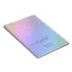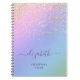 Personalised elegant and girly sparkly notebook featuring faux gold confetti glitter descending from the top against a unicorn pastel orange, pink, purple, blue and green background. You can add your first name in a stylish trendy purple script with swashes. Add one or two lines for a title. Can be used for school and office notes, diaries, gratitude and prayer journals, etc.