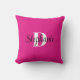 A black cute curly script for her name over a white bold modern monogram letter against solid girly hot pink throw pillow.