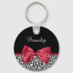 Personalise by adding the name of any girly girl to this girly black and white leopard print keychain with an cute bright red ribbon tied into a stylish bow. This fashionable animal print design is a flat printed image, and does not contain actual ribbon.