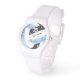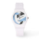 This sporty volleyball wall clock features the realistic image of a volleyball with light blue, black and white panels and white clock face numerals, upon which you can customise her name in a pretty, sophisticated font - the blue and black volleyball panels are blended with a girly floral kaleidoscopic pattern for a textured appearance - by katz_d_zynes