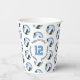 These volleyball themed birthday party paper cups feature multiple small stylised light blue, black & white volleyballs arranged in a simple drop pattern - text on a white circle graphic can be customised, currently the number 12 to represent a child's age encircled by the words, "Happy birthday" - by katz_d_zynes