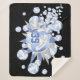 This girly volleyball themed sherpa fleece blanket features an "explosion" of varied size light blue and white volleyballs and blue, grey and white star shapes on a customisable black background - customise with athlete's name and jersey number - the blue and grey volleyball panels are blended with a girly floral kaleidoscopic pattern for a textured appearance, and a tiny white polka dots pattern overlies the blue star - by katz_d_zynes