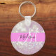 Girly pastel lilac shimmer bokeh glitter sparkles monogram name and initial keychain. Your custom name and monogram are written in an elegant hand lettered script with a pink background. A perfect birthday or Christmas gift!