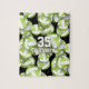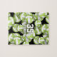 This sporty volleyball jigsaw puzzle for girls features a pattern of varied size lime green and white volleyballs turned every which way on a black background - the non-white panels are light green accented with an artsy, girly, floral pattern - customize with volleyball player's name and jersey number - by katz_d_zynes