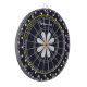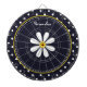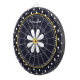 A dartboard with a girly retro mod flower pattern on the top with white daisies with yellow centres against a navy blue background, and a trendy blue and white polka dot pattern on the bottom. Personalise by adding your name. Perfect present for a stylish girly girl.