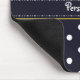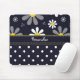 A mousepad with a girly retro mod flower pattern on the top with white daisies with yellow centres against a navy blue background, and a trendy blue and white polka dot pattern on the bottom. Personalise by adding your name. Perfect present for a stylish girly girl.