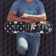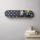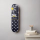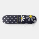 A skateboard with a girly retro mod flower pattern on the top with white daisies with yellow centres against a navy blue background, and a trendy blue and white polka dot pattern on the bottom. Personalise by adding your name. Perfect present for a stylish girly girl.