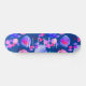 Colorful purple, navy, and pink abstract modern art skateboard with personalized name in casual hand-lettered white typography script.