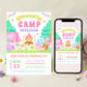 Designed with a clean white background and sweet watercolor-style elements, this invitation is ideal for campground parties, backyard campouts, glamping sleepovers, lake days, or park celebrations. The soft pinks, purples, greens, and yellows create a bright, happy vibe that feels both whimsical and modern.