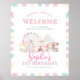This pastel colour birthday welcome sign features a whimsical carnival theme, perfect for celebrating any kid's birthday. It reads "COME ONE, COME ALL! WELCOME TO THE GREATEST BIRTHDAY PARTY ON EARTH!" in a playful, circus-style font at the top, with vibrant illustrations of a ferris wheel, circus tent, balloons, and carousel in soft pastel hues. The centerpiece highlights the child's name in an elegant script followed by the customisable "1ST BIRTHDAY" in bold letters, along with the customisable date and location at the bottom. The border adorned with pastel stripes enhances the festive and cheerful atmosphere of the design.