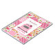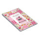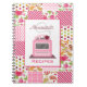 A recipe notebook featuring an illustration of a pink retro stove inside a rectangle over a patchwork background which includes stripes, polka dots, zigzag, floral, gingham, and paisley. Personalise with your name.