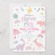 This adorable birthday invitation features hand drawn dinosaurs, rainbows and leaves in pastel colours.