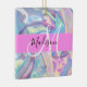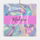Girly pink, aqua and turquoise holographic iridescent monogram name and initial ceramic ornament. Your custom name and monogram are written in an elegant hand lettered script with a pink background. A perfect birthday or Christmas gift!