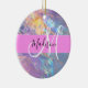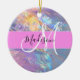 Girly pink, peach and aqua holographic iridescent monogram name and initial ceramic ornament. Your custom name and monogram are written in an elegant hand lettered script with a pink background. A perfect birthday or Christmas gift!