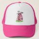 This bright pink and white trucker hat features a stylish pink watercolor golf bag filled with clubs, sitting on a patch of green grass. The design includes a simple serif initial monogram placed right on the bag, making it feel like a natural part of the artwork. The letter is shown in a dark grey, almost black, to match the bag’s accents, but you can change it to any colour you prefer.
