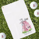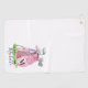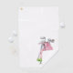 This cute monogram golf towel features a stylish light pink watercolor golf bag filled with clubs, surrounded by a touch of green grass. The design includes a simple serif font initial monogram on the bag, blending smoothly into the overall look. Below the monogram, the full name is elegantly displayed in script typography, adding a personal and feminine touch. The monogram is currently in a dark grey, almost black, but can be customised to any colour you like.