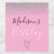 Personalised girly pink and silver glitter sparkles heart birthday wine label. This pretty and glam wine label features your personalised name in black and the word "Birthday" in white with a pink background. The top of the wine label is decorated with sparkly silver glitter confetti, and the bottom has a silver glitter heart in the middle. You can change the text colour and font style using the customise option.