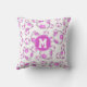 This cute girls' soccer throw pillow features a random pattern of pink and white traditional style soccer balls - white background is customisable - customise with her monogram in a varsity letter style font on a coordinating pink circle pendant - by katz_d_zynes