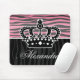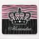 A girly zebra striped pattern in pink and black with a crown. Shown on a mousepad