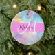 Girly rainbow holographic iridescent monogram name and initial ceramic ornament. Your custom name and monogram are written in an elegant hand lettered script with a pink background. A perfect birthday or Christmas gift!