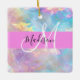 Girly rainbow holographic iridescent monogram name and initial ceramic ornament. Your custom name and monogram are written in an elegant hand lettered script with a pink background. A perfect birthday or Christmas gift!