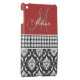 GIRLY, STYLISH, RED, BLACK AND WHITE DAMASK PATTERN YOU CAN PERSONALIZE WITH YOUR NAME AND YOUR MONOGRAM OR YOUR TEXT. ELKE CLARKE© A PHOTO OF A BAND OF DIAMONDS ARE PRINTED ON THE FLAT PLASTIC CASE. A GREAT GIFT FOR HER.