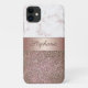 This girly glitter phone case will have your phone protected in style. This trendy design features textures of rose gold and white marble, rose gold faux metallic texture and faux rose gold glitter. Atop the rose gold metallic centre is a name in script typography in dark rose gold to personalise. Makes a unique girly gift for any special occasion. Designed by artist ©Susan Coffey.