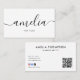 Girly modern script calligraphy. On the back there’s social media icon (facebook, instagram and tik tok) and add your QR Code.