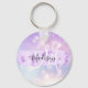 Girly and cute keychain with a colorful pink, purple, lilac and blue unicorn rainbow hearts sparkly background. Your custom name and monogram are written in an elegant hand lettered script with a lilac purple unicorn paint brush strokes stripe background. A perfect birthday or Christmas gift!