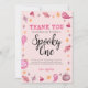 Thank your guests for celebrating your spooky one's first boo day in Halloween style with this cute thank you card! Set with pink background and hand painted ghosts, stars, Halloween candy, and pumpkins. Simply edit with your little one's name and message to truly make it your own. Originally hand painted with watercolors.