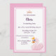 Girly swan party for a 2nd birthday invitation card in white and pink. On front a white background, pink frame, and a pink swan wearing a royal golden crown, tiara as decoration. Purple letters. Templates for name and your party information.