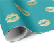 This wrapping paper features girly faux gold foil kiss lips pattern on teal background.