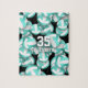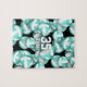 This cute volleyball jigsaw puzzle for girls features a pattern of varied size turquoise and white volleyballs turned every which way on a black background - the non-white panels are coloured with a bright turquoise blue accented with an artsy, girly, floral pattern - customise with volleyball player's name and jersey number - by katz_d_zynes