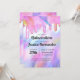 This girly and glamourous quinceañera birthday party invitation is perfect for the girly girl. It features faux printed sparkly unicorn rainbow colour thick glitter drips on top of a holographic iridescent background. The typography is an elegant cursive script with a modern serif font to match. The colour scheme includes pink, peach, blue, purple, yellow, and coral. It's chic, pretty, unique, and luxurious; the perfect design for your special day.