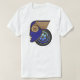 The humourous trompe l'oeill adorning this trend-setting Art Deco T-Shirt will have you wondering whether the royal blue & gold image is the front end of a classic touring car - or a profile of the god Mercury overlapping a fancy wheeled tire?