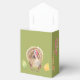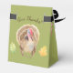 Adorable Thanksgiving Favour Box. This design has a light green background, which can be customised. The front and back design has a brown turkey with green and yellow fall leaves. Over each turkey are the words, "Give Thanks!", which can be customised with a name or phrase. On the the sides there are branches with more fall coloured leaves.
