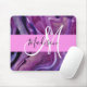 Glam abstract purple, lilac and violet shimmer liquid texture monogram name and initial mouse pad. Your custom name and monogram are written in an elegant hand lettered script with a pink background. A perfect birthday or Christmas gift!