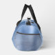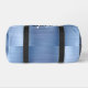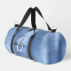 This personalised duffel bag features a monogram and first name in modern black and white script on a glam blue faux brushed metal background.