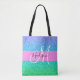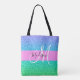 Girly and glam blue, green, aqua and turquoise mermaid glitter sparkles gradient monogram name and initial tote bag. Your custom name and monogram are written in an elegant hand lettered script with a pink background. A perfect birthday or Christmas gift!