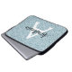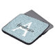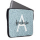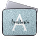 Girly and glam blue silver glitter sparkles monogram name and initial computer sleeve. Personalise with your custom name in an elegant black script and your monogram initial in white. You can change the text colour and font style and size using the customise option.