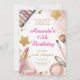 Chic watercolor design featuring gold stars, makeup brushes, lip gloss, and blush tones. Perfect for a glamourous spa or makeup birthday celebration for girls.
