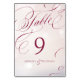Romantic handwriting calligraphy script in faux burgundy glitter on subtle blush sparkle bokeh background, elegant and sophisticated, great wedding table number cards for luxury wedding, glam vintage wedding, and traditional wedding in spring, fall and winter.