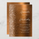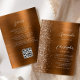 The left-hand edge of this elegant modern wedding invitation features a burnt orange faux glitter border. The customisable text combines white handwriting, copperplate and italic fonts on a burnt orange faux brushed metal background. The reverse side provides space for wedding details on a burnt orange brushed metal background, along with a QR code guests can scan to visit your website and RSVP, which saves the cost of printing and mailing separate RSVP cards.