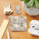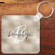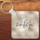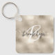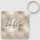 This elegant personalized keychain features a monogram and first name in modern charcoal gray and white script on a glam champagne gold faux glitter and foil background.