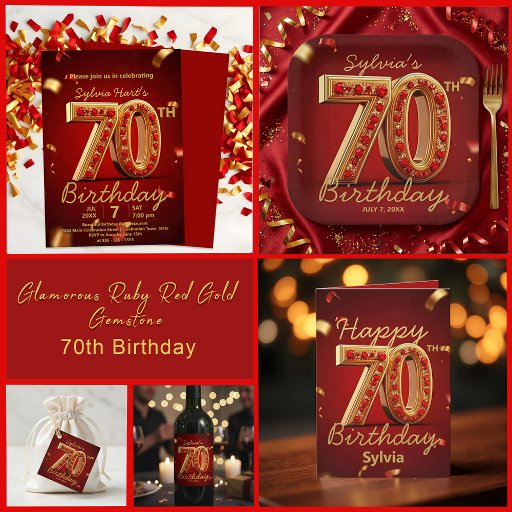 The design features a striking, 3D-rendered "70" adorned with dazzling gold metallic plating and shimmering ruby red gemstones. The background is a rich, festive deep red or burgundy color.