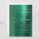 The left-hand edge of this elegant modern wedding invitation features an emerald green faux glitter border. The customisable text combines white handwriting, copperplate and italic fonts on an emerald green faux brushed metal background. The reverse side provides space for wedding details on an emerald green brushed metal background, along with a QR code guests can scan to visit your website and RSVP, which saves the cost of printing and mailing separate RSVP cards.