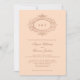 This elegant wedding invitation features a soft blush pink background designed with an ornate, vintage faux rose gold frame. Your initials and the rest of the text appear in a matching rose colour. Here is the matching RSVP card: