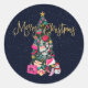This girly and glamourous Christmas sticker will be the talk of all your friends and family. It's a unique and stylish concept for your holiday papery. It depicts faux gold glitter typography saying, "Merry Christmas." It also features hand-drawn and hand-painted watercolor purses, high heel shoes, faux glitter ornaments, makeup, perfume bottles, wallets, candy canes, gift bag, and gift box. These elements are hung on a green snowy Christmas tree with a gold star topper. The background is a dark navy blue watercolor night sky with flurry snow falling on the ground. The colour palette includes bright pinks, blush pinks, coral pinks, black, gold, silver, red, peach, forest green, and white. It's a beautiful, chic, and trendy design for the modern fashionista which is infused with holiday spirit!