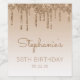 These chic 50th birthday wine bottle labels feature a sparkly gold faux glitter drip border and gold ombre background. Personalise them with her name in brown handwriting script, with her birthday and date below in brown sans serif font.